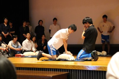 5月16日(水)、澤柳記念講堂にて、第二回学校包括支援員研修会が行われました。その中で、中学校高等学校体育科の島田教諭がBLS(Basic Life Support=一次救命処置)講習のパートで講師を務めました。この日は高等学校水泳部ライフセービング部門の生徒6名もサポートに入り、学校包括支援員の教員の皆さまに実践的な研修を受講していただきました。
