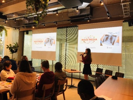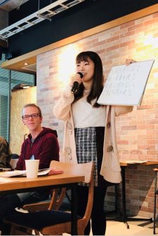 まず、成城大学に在学する香港人留学生が「外国人にとって日本語の難しいところ」という題で発表をしました。漢字の意味が中国語と日本語で違う点、和製英語、敬語の使い方が難しい事などユーモアを交え紹介し、自身のアルバイトでの経験をもとに「外国人の日本語の間違いに対して、寛容になって欲しい。そして、間違えている部分は正しい日本語を教えて欲しい」と訴えました。