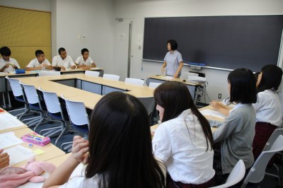 教室では各学部の特徴などを説明しました。希望する学部・学科の説明を聞く生徒たちの表情は真剣です。経済学部は大学のパンフレットを使って何を学んでいるのか、就職についても説明。「成城大学は就職率が良くて、コミュニケーションが取れる、真面目で素直と評価されています」とアピールしました。その後は経済学部の特長でもあるゼミを体験してもらい「医師不足問題を経済学で考える」「身の回りから考える中国経済」などのテーマについて考えてもらいました。文芸学部は6学科に分かれてそれぞれ具体的な内容を説明。法学部は学部長の挨拶の後、どんなことを学ぶのかを伝えました。社会イノベーション学部は現役大学生が登場し、学生生活について話をしてもらいました。大学を身近に感じてもらい、今後の進路の参考にして欲しいです。
