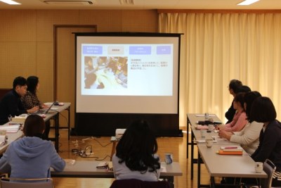 今年度も、年少さん、年中さん、年長さん、それぞれの活動が東京農大の学生により企画、実践されました。「野菜当てゲーム」「野菜スタンプづくり」「稲穂の観察」などの体験型プログラムや、東京農大OBの農家の方との交流を通して、農作物や生産者、農村の景観について学ぶことを活動のねらいとしました。報告会ではこれらの成果や、次年度の環境学習の方向性について発表されました。