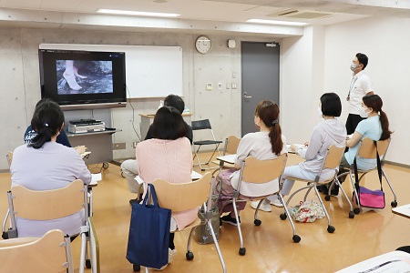 前半は動画教材と講義で、川やプールでの事故がどのように起きるかを知り、それをいかに回避するか、また、アクシデントが発生したときの対応を学びました