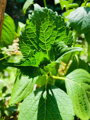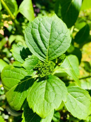 蕾を横から支えるように大きく広がる紫陽花の葉