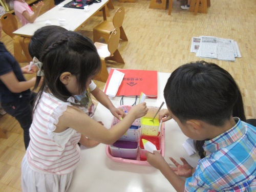 ちょうど昨年度の5月の今頃、年中児数人が固形絵の具を水に溶かして、色水遊びをしていました。自分でチョイスした絵の具を混ぜて、偶然できた色を喜び、何度も繰り返し楽しんでいました。通りかかった年長児が「紫作りたいなら、これ(赤)とこれ(青)混ぜればいいんだよ。」と絵の具を指差して教えてくれます。外遊びに行く途中の年少児が、興味津々といった表情で覗き込んでいました。1つの遊びの場面を切り取っても、それぞれの経験の積み重ねによる、かかわり方の違いが見られます。