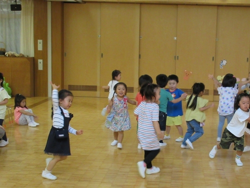1学期は、特に、自由遊びの時間を多くとるようにしました。好きな遊びを楽しみながら、自然に友達に興味関心を示し、友達とのかかわりが生まれることが多いからです。また長梅雨で雨が多い中、外に行けるときは予定変更してでも外遊びをしました。外遊びをすると表情も和らぎ心身ともにエネルギーを発散して楽しんでいました!雨でも、ホールを使用し、広い場所でピアノに合わせてスキップをしたり、教師と一緒に変身(魔法の粉を振りかけて、忍者や動物、プリンセスや乗り物などに変身)ごっこの表現遊びをしたり、たけのこ体操などで身体をたくさん動かしました。また、友達の名前の紹介もなるべく毎日行いました。子どもたちには半円状に椅子に座ってもらい、対面にいる担任の前に、1人ずつ呼んで立ってもらいます。最初は担任1人が名前を呼んでいたのに、少しずつ友達も一緒に名前を呼んでくれるようになりました!友達から名前を呼んでもらえると、お子さんもとても嬉しそうな表情でした。そして、自分のしたい話を手を挙げてみんなの前で話す機会も作りました。