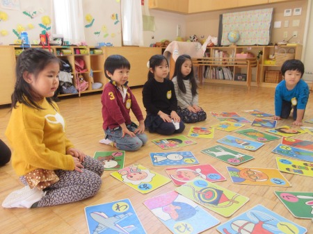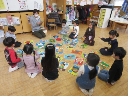 1月は日本の伝承遊びに触れる機会も意識して、凧揚げ、カルタ取りや、独楽回し。各学年の年齢に合わせた遊びを経験しました。2月に入り、節分の豆まきをしたり、年長組は創作劇に向けて始動したところです。クラスの集まりでは、自分の思いを言葉にすること、人の話を聞くことも大切にしています。「作った物を皆に見せたい」「皆に話したいことがある」「発表したいことがある」。10人の集まりでは、いつもよりもじっくり話が出来たり、友達の発表を聞くことが出来ます。これも分散登園だからこそと言えます。