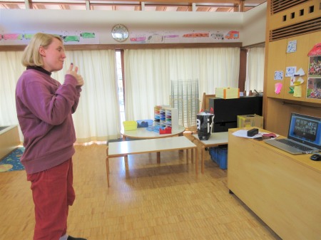一斉活動では、担任は両クラスを行き来し、子どもたちの活動を見守り、把握するように意識しましたが、これが教師にとっては新たな勉強の機会となりました。活動の導入の仕方、声のトーンや言葉をかけるタイミング。事前に打ち合わせは綿密にしていても、教師によってカラーが出ます。こんなアプローチの仕方があるのか、自分もやってみよう、という機会になりました。研修会などでは経験していますが、色々な活動で複数の教師の保育を見られるということは願ってもないチャンス、とこんな事態の中でもプラスになることの発見でした。