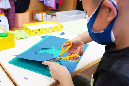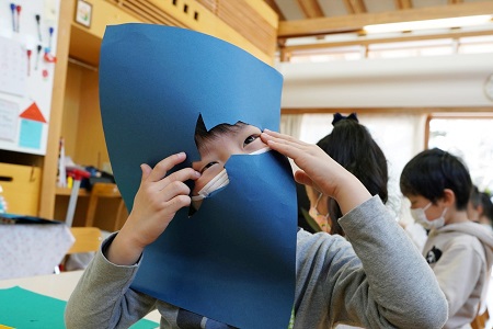 ある日は、好きな色を自ら選び、それを好きな形に切り抜く。普段なら切り抜いて形となった方を別紙に糊づけして自分の表現を展開します。でもこの続きとして敢えて逆転要素となる、切り抜いた跡として穴が残っている方の画用紙を使って表現する形あそび。
