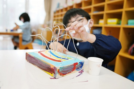 またある日は、「もし、お空にお絵かきが出来るとしたら?」と投げかけ、一体どんな線の形になるのかという、今の常識ではあり得ない世界をみんなで想像してみました。そしてそのイメージを、今度は別の素材を用いて実際に表現することで、2D作品と3D作品それぞれの、表現の違いから来る面白さや不思議さを体験したワイヤーアート。