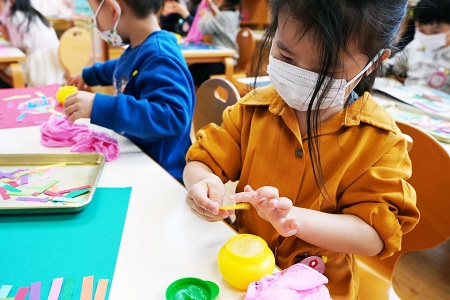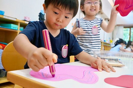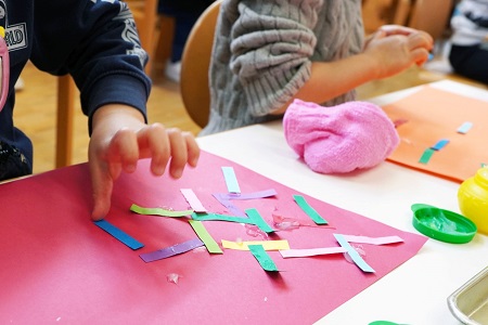 変わった糊づけ方法のおかげで糊が勿体なかったり、机が汚れたり、、、といった心配は、少なくともそれが幼稚園内であれば、全く気にすることは無いのです。それよりも、もっともっと目を向けてほしい気づきや感動が、目の前にあるのですから。