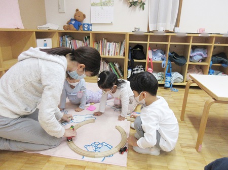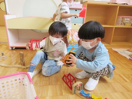 友達同士の関係は、「まだ相手の名前も分からない」という段階です。幼稚園で自分の好きな遊びを見つけ毎日遊べるようになってきた中で、ふとした瞬間に隣に同じおもちゃを使っている友達の存在に気が付き、眺める。たまたまトイレの順番を待っている時に自分の前に並んでいた子・棚が隣同士でよく近くで支度をしている子など、日常での些細なことがきっかけとなり少しずつ自分以外の友達の存在に、興味を持っていくようになります。まだ緊張してしまい、自分で「一緒に遊ぼう」と話しかけるのは難しい子もいるため、教師が一緒に友達に声をかけ、子どもたち同士が繋がりを持てるようにしています。また、クラスの集まりの中でも「この子は○○ちゃんね」と友達の紹介をしたり、「○○く~ん」とみんなで名前を呼んでみるなど、友達に目が向くように、また友達や教師から呼ばれることの嬉しさを味わえるような内容を保育の中に積極的に取り入れてきました。