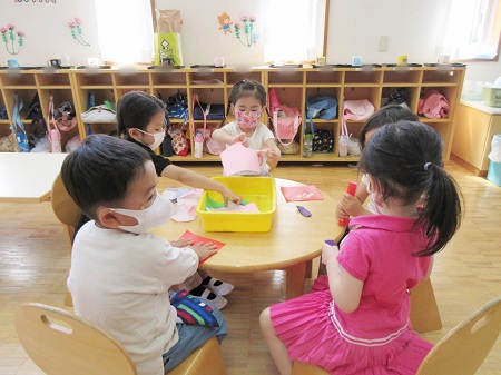 年少組が入園してから約1か月という月日が流れました。年長・年中組の子どもたちは年少組の入園を心待ちにしており、自分の朝の支度が終わると年少組の様子を気にかけ、よく手伝いに来てくれました。年少組にとっては、新しい環境での集団生活。希望に胸が膨らみつつも緊張したり、朝一緒に幼稚園へ来た保護者の方とのお別れが寂しくなって涙を見せるお子さんも初めのうちはいました。