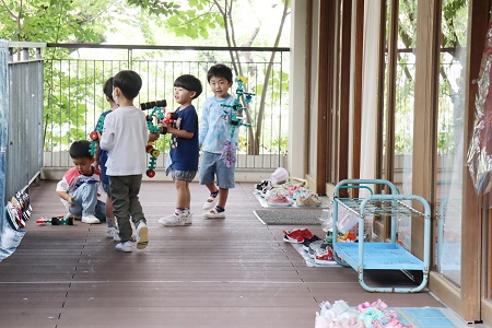 今年4月初め、大泣きして玄関前で中へ一歩も入ろうとせず、最後は教師に抱かれて母親と別れた子の一人だったAちゃん。大泣きしながらも自分で上履きを履くようになり、泣きわめきながらも母親と手を繋ぎ少しずつ自分で歩いて保育室への距離を縮めて行く姿に必死で不安と闘い一生懸命それを乗り越えようとしている当人の中で起きている気持ちの変化・努力が伝わってくる。きっと大きな声を出さなければ、自分でも捉えどころのない不安と闘う元気が出ないのだろうなぁと思えたりする。登園後には楽しく遊び笑顔で降園していく姿や、泣かずに登園した日が数日続いた後でも、再び泣いて登園という姿もあり、当人のペースで「心配なことは無いんだ」と当人が納得していくのを見守ることでしか解決できないことだと感じさせられる。当人もさることながら、親にとっても試練の日々である。玄関で園児一人一人と朝の挨拶を交わしている二人(ネイティブ講師のジェイミーと私)で、子ども達の日々の変化を確認し合い、一喜一憂していた約1か月前までの毎日が、ちょっと懐かしいと感じられる、余裕が出てきた今日この頃である。
