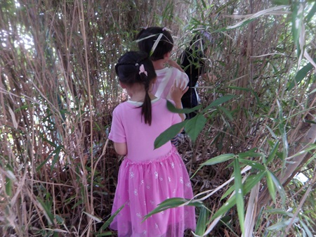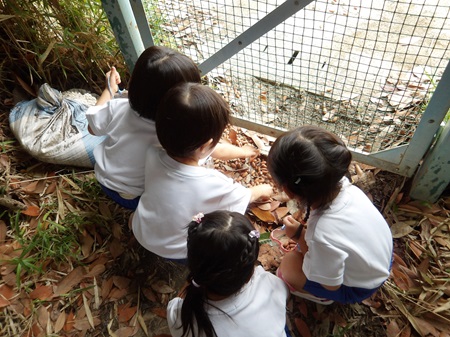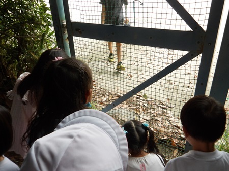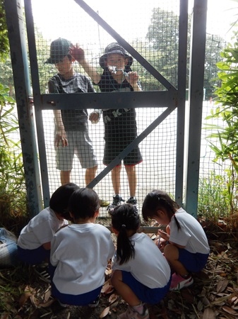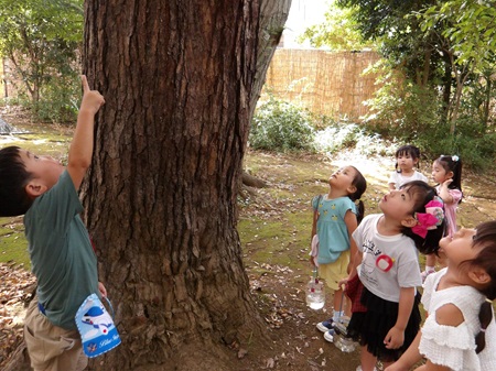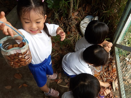 幼稚園の2学期が始まって2週目の出来事です。年少組の子どもたちは、園庭で夏休みの間に脱皮したセミの脱け殻探しに夢中になり、毎日驚くほど多くの脱け殻を見つけては持ち帰っていたのですが、徐々に見つからなくなり、下火になってきていました。毎日園庭で見つけたものを持って帰り、「おみやげ~!」とお家の方に渡すのを楽しみにしていた子どもたちは、「次は何を探そうか?」と色々な場所に探検に出掛けていました。すると、クラスの何人かの子が「あっちにどんぐりがあった!」と報告をしに来てくれたので、「どんぐり探検隊」と称し、ペットボトルで作った個人持ちのバッグを手にさげ、みんなで出掛けることにしました。ちょうど、幼稚園と初等学校の校庭がフェンス越しに繋がっている場所に、どんぐりの木があり、毎年沢山のどんぐりや、どんぐりの帽子の部分が落ちてきます。子どもたちは2~3日の間、夢中になってどんぐり探しをしました。しかし、そこのどんぐりも徐々に目を凝らさないと見つからないようになり、「なかなか見つからない…先生、一緒に探して!」ということになってきました。「どこに落ちているかな…」と私も一緒に探していると、一人が、「あっちに沢山落ちている!!!」と初等学校のグラウンドを指差しました。確かに金網のドア1枚隔てた隣の初等学校のグラウンドには、まだ手付かずのどんぐりが、びっしりと落ちていました。どんぐり探検隊の子どもたちは、とっておきの宝物を見つけたかのように目を輝かせて、みんな口々に「あれが欲しい!!」と叫びました。