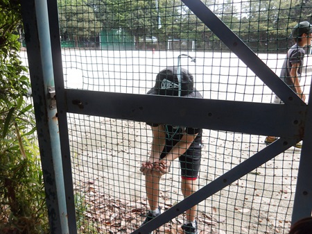 と言うと、2人は初等学校のグラウンド側にあったどんぐりを素早く集め、幼稚園側に手で押し流し始めました。