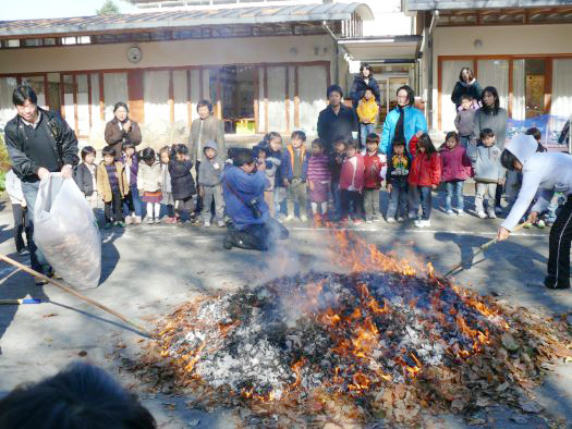 11月19日(金)に年長年中の子どもやきいもたちが掘ってきたさつまいもで焼き芋をしました。おじさんや管財課の職員の方にお願いして集めた枯葉を園庭の一角に積み上げて、自分たちで半紙とアルミホイルに包んださつまいもを思い思いの場所に仕込んで着火します。初めてたき火を見る年少さんは何が起きるのか興味津々、顔や手に感じる炎の熱さや猛烈な煙など新しい体験に興奮していました。待つこと約1時間、ずうっと待っていた年中さんが最初の焼き上がりを味わいました。この日のおべんとうは皆でホールに集まり合同で食べました。一段と楽しいお昼になりました。