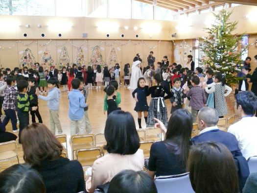 幼稚園2学期最後の行事クリスマス会が開かれました。この日に向けて歌やダンスそして器楽演奏の練習を重ねてきました。年少・年中・年長3学年の成長の段階が明確に見えるメリハリのある活動です。お話は、壁に飾られたオーナメントの2つが動き出し会に参加するところからはじまります。この2つ、姫とムーミンそして途中に現れるサンタクロースのおじさんが狂言廻しとなって子どもたちの歌・ダンス・楽器が繰り広げられました。緊張の中にも心から楽しんでいる様子が見られ、見ている保護者の方々の顔から思わず笑みがこぼれます。出し物が終わったらもちろんプレゼントタイム。でもサンタさんは忘れて帰りそうになって子どもたちからブーイングを浴びます。
