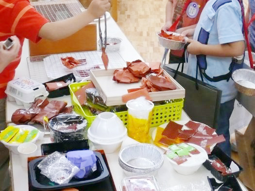 今年も年長がお店屋さんを企画しました。お店を決めてグループを作り製作開始です。今年はおもちゃや、おはなや、ぺっとしょっぷ、おけしょうや、おすしや、やきにく・ぎゅうどんや、どーなっつや、たこやきや、おべんとうやの9店舗になりました。品物に合わせ使いたい素材を選び、自分たちで考えて次から次へと品物が増えていきました。それを見て、更に製作意欲がわいたようです。感心するほど工夫された品物が出来上がりました。年中はお金とお財布を作り、買った品物を入れる袋を用意し準備しました。5日目に開店して、年中組、年少組も招かれて楽しい買い物が出来ました。年長児は売り切れて大喜びでした。