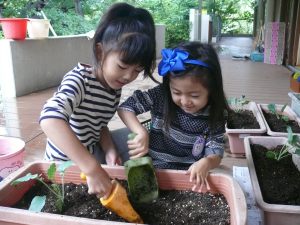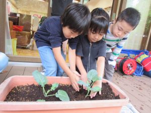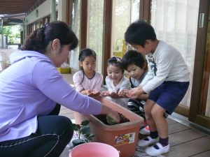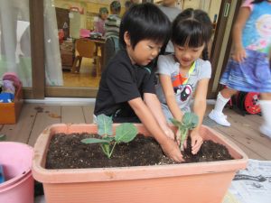 あいにくの雨で外では出来ませんでしたが、「早く大きな家に引っ越したい」と言わんばかりに、苗たちは待ってくれていましたので、保育室前のデッキで行いました。