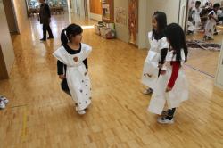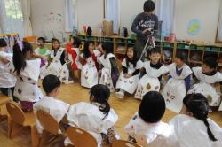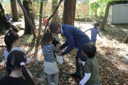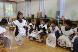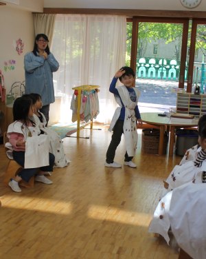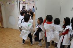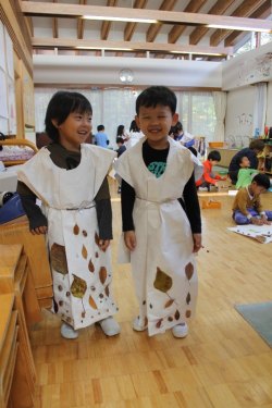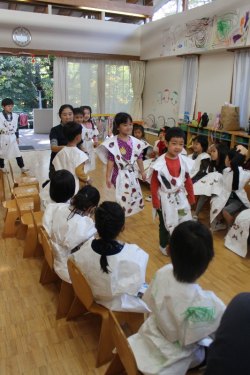11月16日(月)、連携を結んでいる東京農業大学の学生4人が〝先生〟となり、年中を対象にした環境学習が行われました。造園学科で学んでいる4人は自然環境教育に興味があるそうで、前日に作ったというかわいい手作りの絵で落ち葉の仕組みを教えてくれました。落ち葉を拾ってオリジナルの洋服を作り、最後にファッションショーをするというのが今回のテーマ。園庭でたくさんの落ち葉を拾った園児たちは、教室で紙のお洋服に落ち葉やどんぐりなどを貼り付け、個性あふれる世界で1枚だけの素敵なお洋服を作りました。完成後はそれぞれの教室で作ったお洋服を着てファッションショー!最初は恥ずかしがっていた小さなモデルさんたちですが、最後は大行列ができるほど堂々としたランウェイを披露していました。写真を見ても楽しそうな様子が伝わってきますね。