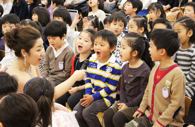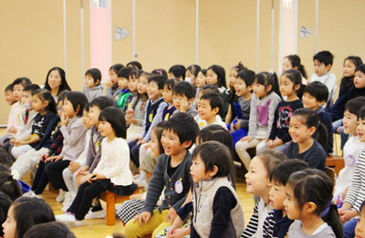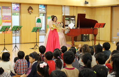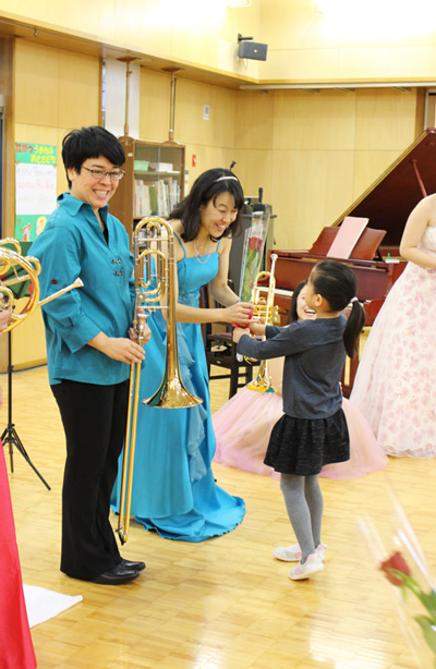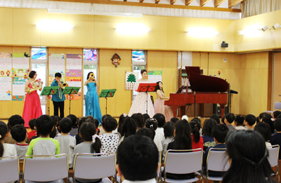 12月3日に音楽鑑賞会が行われました。お姫様のようなドレスを着た女性5人がホールに姿を見せると、会場が一気に華やかになりました。ピアノ、トランペット、トロンボーン、ホルンの楽器について教えてもらったり、オペラ音楽や「たのしいね」「クリスマスソングメドレー」「サンタが街にやってきた」などの歌を楽しく歌いました。11月28日の「90周年記念ふれあいコンサート」で森山良子さんと歌った「この広い野原いっぱい」「うたえバンバン」も演奏に合わせて大きな声で歌いましたよ!身近で楽器と音に触れ、子供たちは笑顔いっぱいでした。