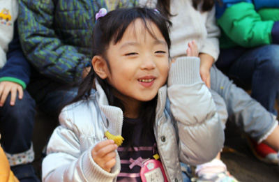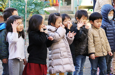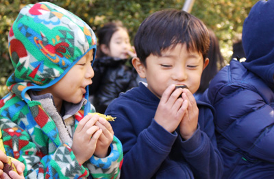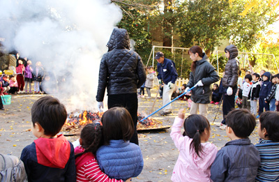 冬晴れの空の下、出来上がりをいまかいまかと待ちわびる子どもたちは、おいもに向かって「おいしくなーれ!」の大合唱。「あんなに近くにいて大丈夫かなぁ」と熱い火の近くで焼き芋を焼いてくれている先生たちを心配する優しい声もありました。