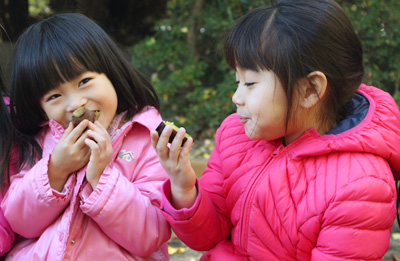 この日のために学園内で集められた落ち葉は、なんと30袋以上。「銀杏の葉は油が多すぎるので入れてはダメ」、「蒸し焼きにするために途中でぬれた落ち葉も入れる」、など、職員の知恵袋もフル活用され、約40分掛けて焼き上がったおいもは、ほっくほく。できたてアツアツのおいもを頬張りながら「あま~い!」と子どもたちの笑顔がこぼれおちていました。