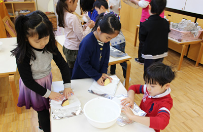 「♪焼き芋、焼き芋、おなかがグ~♪」焼き上がるまで、手遊びで大盛り上がり。