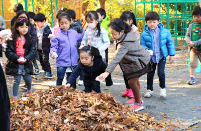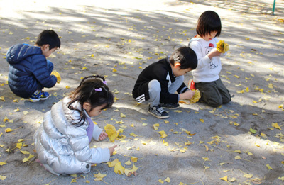 こちらは園庭に落ちている銀杏の葉で花束作り。