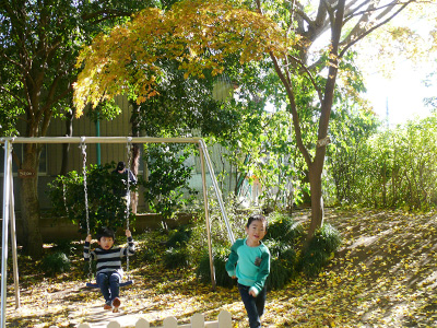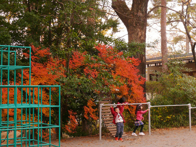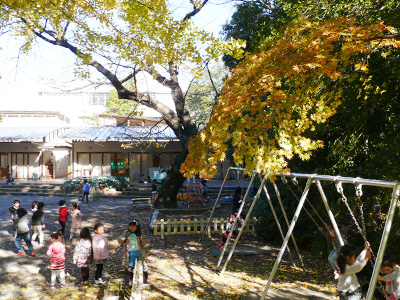 美しい紅葉の中、子どもたちが存分に体を動かして遊んでいます。