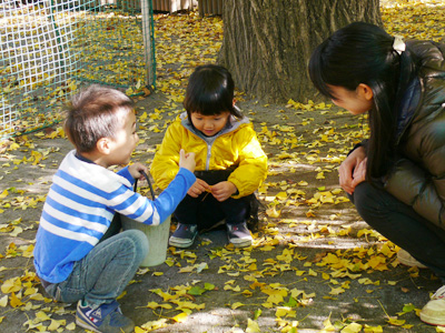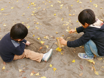 年少組はイチョウを集めたり、落ち葉を元に地面に絵を描いたり。