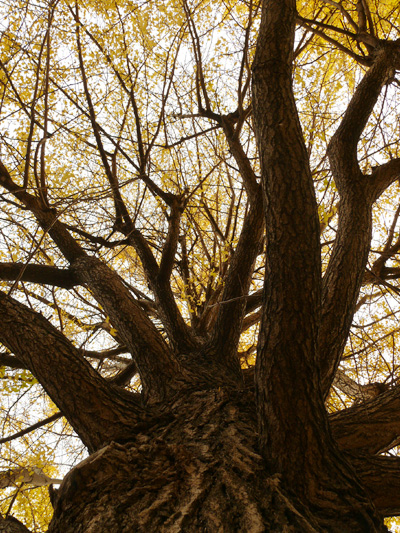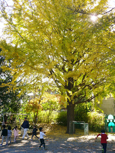 一番大きいイチョウの木の周りで遊ぶ子どもと、真下から木を見上げてみました。 すごい眺め!