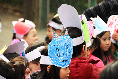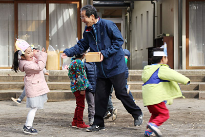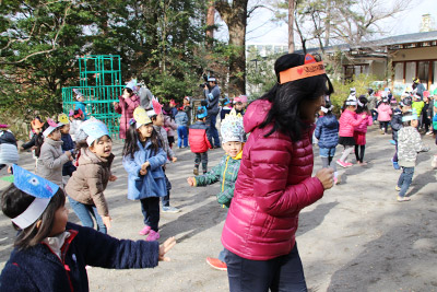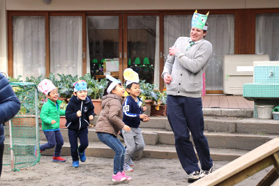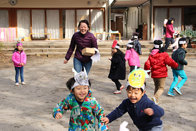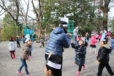 2月3日の節分、幼稚園では豆まきをしました。園庭には、目がたくさん描いてある鬼や、怒った顔をした鬼、泣いている鬼など、いろんな鬼が勢ぞろい。まずは子どもたちが鬼の役。先生たちが豆を投げると、園庭をところせましと逃げ回ります。こうして、心の中にいる鬼を先生たちがやっつけてくれました。そして次は鬼の役を先生に交代。子どもたちは笑顔で「待て~!」と追いかけました。