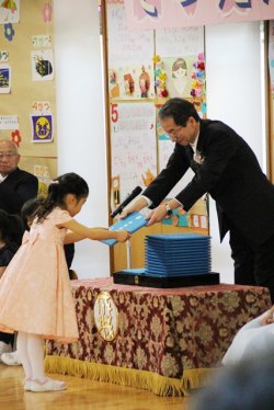 油井学園長のお祝いの言葉の中で、来賓として出席した初等学校の加藤陸雄校長が紹介されると、卒園児全員で「4月からよろしくお願いします」とあいさつ。加藤校長が「お任せください!」と答える微笑ましい場面もありました。4月から小学生。1年生になったら友達100人できるかな?