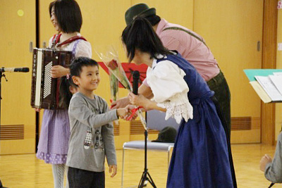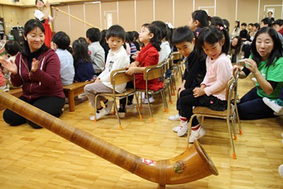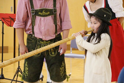 「アルプホルン」という2m以上ある長ーーい管楽器や、もともとは牛の首輪として使っていた「クーグロッケン」という鐘など、アルプス地方にある楽器が登場。楽器の先に顔を近づけて音を聞いてみたり、実際に音を鳴らしてみたり、音色に合わせて踊りました。また、子どもたちは「赤鼻のトナカイ」を英語で披露。練習してきただけあって、とても上手でした!