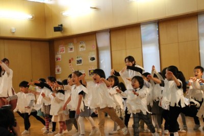 まずは年少さんの表現遊び「おばけのバケちゃま」。白い衣装に身を包み、お化けになって先生をビックリさせました。年中さんは「忍者参上!~校長先生を探せ~の巻」というタイトルの劇遊びで、みんなが忍者に変身。「抜き足、差し足、忍び足」でそっと歩く姿がとてもコミカルで可愛いらしかったです。年長さんは4グループに分かれて創作劇を行いました。2月から準備に取り掛かり、ストーリーやセリフ、道具も全て自分たちで考え、練習。始まる前に教室から聞こえてきた「エイエイオー!」という全員の掛け声が、これまでの頑張りを表していました。劇の前に「頑張ってね」と声を掛け合う姿はとても微笑ましかったです。新年度が始まった4月から11か月。園児たちの成長の証が、この日の演技にありました。