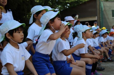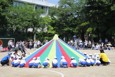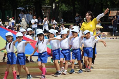 5月20日(土)、快晴の青空の下、初等学校運動場で第24回春の運動会が行われました。今年は成城学園100周年ということで、年中さんはケーキにイチゴをのせて完成させる「おめでとう100周年!ケーキを作ろう!」という競技がありました。「パティシエになったつもりでケーキを作りましょう!」という前田園長の掛け声で、よーいどん!パティシエになった園児たちは一生懸命イチゴをケーキの上にのせ、最後は4チームのケーキを合体した大きなケーキにロウソクを立ててお祝いしました。バルーン体操では、年長さんが鮮やかな演技を披露。初めての運動会となった年少さんは、かけっこなど2種目を頑張りました。親子競技や保護者による綱引なども含め全13種目。炎天下での開催でしたが、子どもたちは練習の成果を発揮し、最後まで元気いっぱいでした。