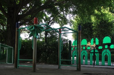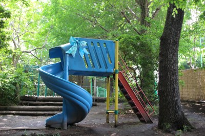 園児全員が園庭に集合。工事で撤去されるのは、アスレチック、滑り台、東屋、渡り鉄棒の4つの遊具です。まずはトンネルの山の上で年長さんによる「にじ」の大合唱。1人ずつにマジックが手渡されると、遊具に思いっきり落書きをしました。落書きといっても、園児たちが描いていたのは「ありがとう」や「だーいすき」などの感謝の言葉や、ハート、子どもたちの顔などの絵。これまで一緒に遊んでもらった感謝の気持ちを込めていました。続いて、年長・年中・年少さんそれぞれがプレゼントを用意。折り紙で作ったレイや折り紙、絵などで遊具を飾りつけしていきました。そんな園児たちのもとに、遊具の小人さん3人が登場!「たくさん飾ってくれてありがとう!」と園児たちに感謝していました。小人さんの前で全員で「かたつむり」を歌ったり、楽しくお話をしたりしました。これまで一緒に遊んでくれて、本当にありがとう!