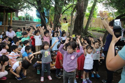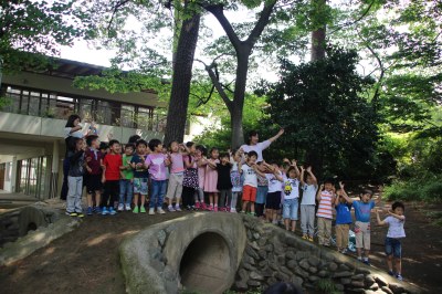 トンネルの上で合唱する年長さん