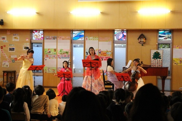 フルートとチェロを演奏しながらメンバーが入場すると、演奏に見入る子供たち。「ドレミのうた」や「サンタが街にやってくる」など4曲を一緒に歌ったり、クリスマスソング4曲を聴いたりしました。楽器紹介では、二胡がヘビの皮や動物の骨でできていることを教えてもらうと「えーーーっ」という驚きの声が挙がりました。演奏が素晴らしいと思ったら「ブラボーって言うんだよ!」と歌のお姉さんから教えてもらうと、演奏が終わるたびに早速「ブラボー!」を連呼する子どもたち。自分たちの歌を披露した際には、保護者の方から「ブラボー」の声が飛び、とても嬉しそうでした。