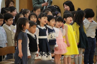 お母さんと一緒に手をつないで入場し、1人ずつ名前が呼ばれると「ハイッ」と大きな声でお返事。年長さん、年中さんのやさしいお兄さん、お姉さんからは「きょうからおともだち」や、年少のクラス名にちなんだ「れんげのうた」「なのはなのうた」の歌と、手作りのレイをプレゼントしてもらいました。西谷園長は「遊んだり、歌ったり、作ったり、楽しいことがいっぱいだよ」と笑顔で話しかけました。