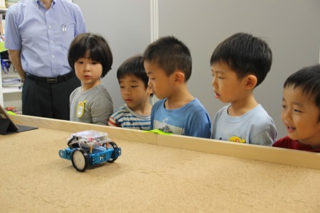 まっすぐ進んだり、回ったり、曲がったり…いろいろな動きをするロボットに興味津々