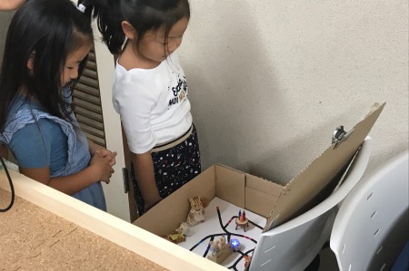 「データサイエンス」という分野の専門の先生方のお部屋には、珍しいものがたくさん!まずはPepperとご対面。「こんにちはー!」と元気よく挨拶をすると、Pepperに一人ひとり順番に名前を呼ばれて子どもたちはびっくり!「すごい!お話できるんだ!」と感心する子どもたち。続いて、子どもたちがPepperの頭をなでると、パネルに花や風景の写真が表示され、「この季節は何?」とクイズが出題されました。子どもたちは勢い余って思いっきり大きな声で口々に「なつー!!なつー!!」と答えます。正解を答えているのにPepperからは「残念…」の一言。なんでかなぁと考えると、先生方から「声が大きすぎるかも」「みんながバラバラにいうと、「夏」じゃなくて「なつなつなつなつ!」という言葉に聞こえちゃうよ」とヒントをもらいました。そこで、声の大きさを調整したり、小さい声で「せーの」と言って声を合わせてみたりすると、Pepperがちゃんと聞き取り、正解に!プログラミング教育において大切な「試行錯誤」を体験することができました。