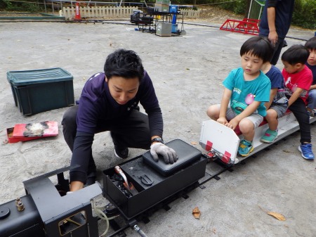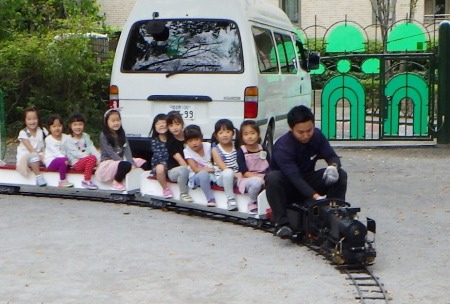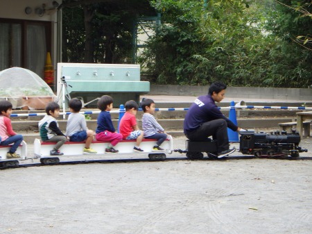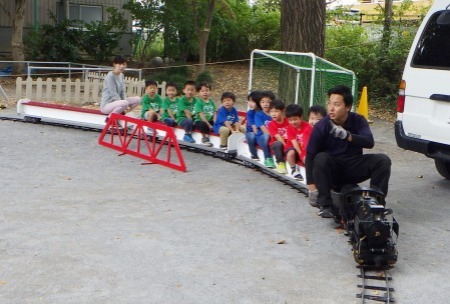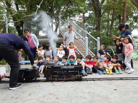10月12日(金)、ミニSLが幼稚園にやって来ました。園児たちには当日まで秘密のサプライズ企画でした。石炭にも興味津々の園児たち。朝まで小雨模様だった天気を心配しながらもテラス往復ではなく園庭一周コースを決めた園長の決断は大正解。長い距離を連続で走れ、スピード感も、またカーブの楽しさも味わうことができました。全員が園庭2周を2回、直に風を感じながら、最高の気分を味わいました‼