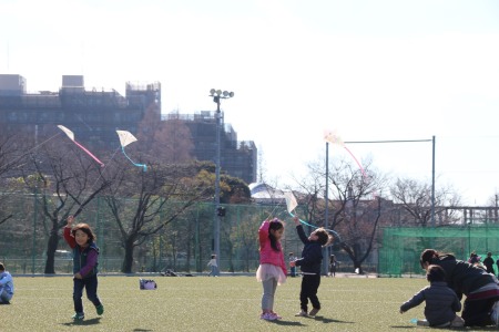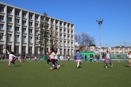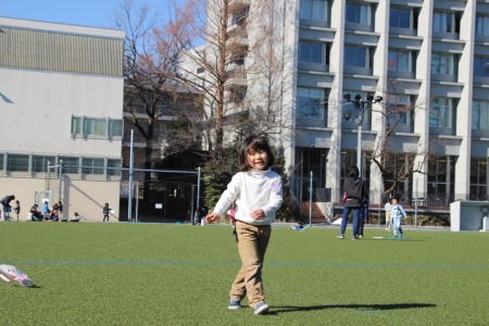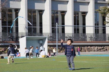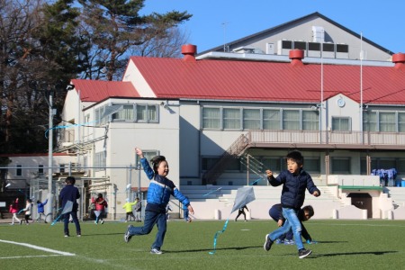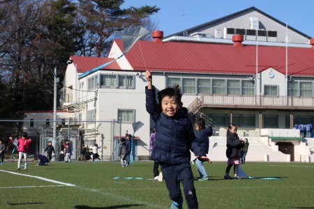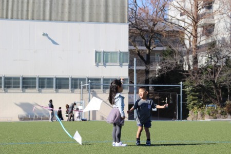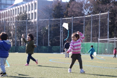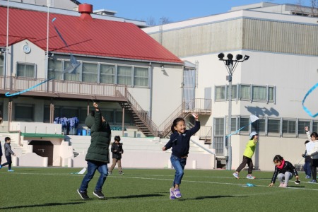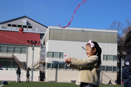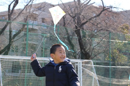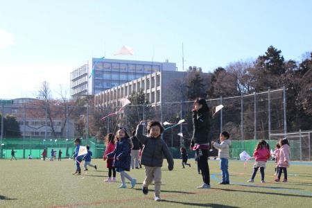 1月22日(火)、幼稚園では凧揚げをしました。自分たちで色を塗ったり絵を描いた色とりどりの凧を手に大グラウンドを思い切り走りました。「見てみて!高くあがった!」「走らなくても風があるとあがるよ!」と子どもたちは凧揚げに夢中。雲一つない青空の下、元気いっぱい凧揚げを楽しみました。