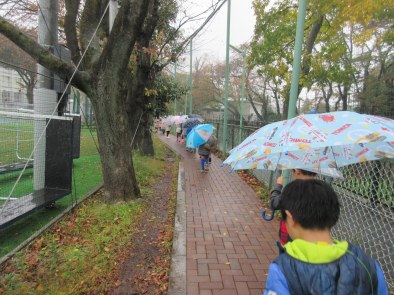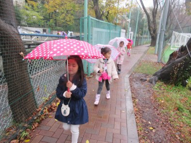 園外に出る時にはいつも雨が味方してくれる年長組。この日もしっかり雨が降り、お財布を肩にかけ、元気よく傘をさして出かけました。(日本で一番傘を上手にさして歩ける幼稚園児かもしれませんね!)