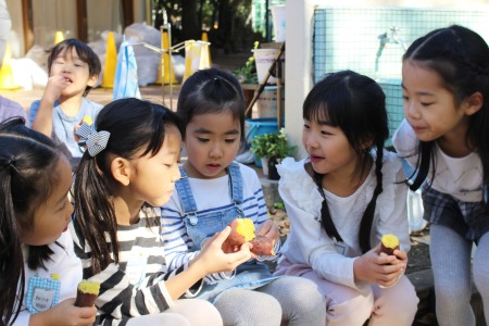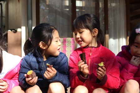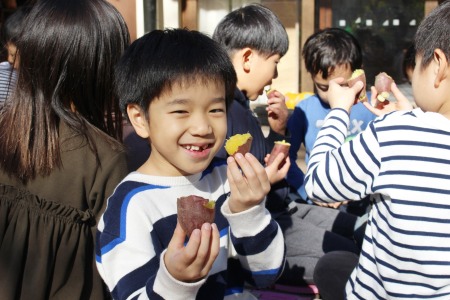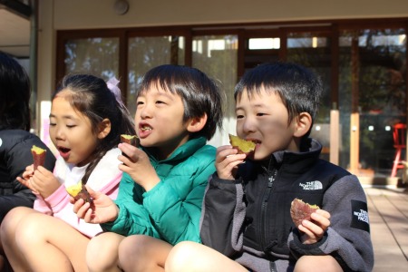 「おいしい焼き芋ができますように!」とみんなで掛け声をかけて、園長の西谷先生が大きな落ち葉の山に点火!落ち葉の山が燃え始めると子どもたちから歓声が起こりました。「おいしくな~れ!おいしくな~れ!」と声をかけたり、周りでたき火ごっこをして遊んだり、煙から逃げ回ったり…そんなことをしているうちに、ついにお芋が焼きあがりました。「いつも食べるお芋よりも甘~い!!」「おいしくてほっぺたが落ちちゃう!」おいしいお芋を食べて、みんな笑顔。食べ終わった後は、焼いてくれた先生や職員の皆さんに「ありがとうございました!」とお礼を伝えました。