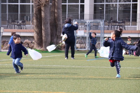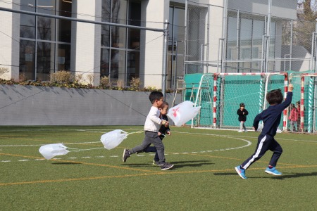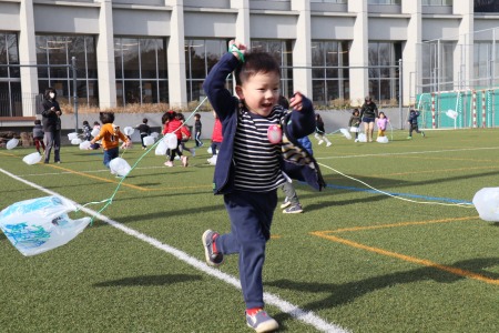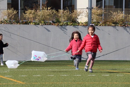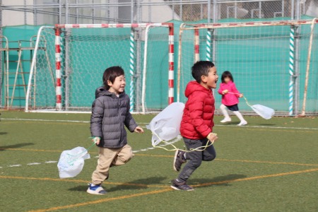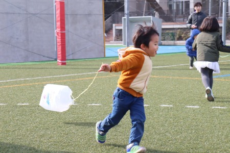 1月17日(金)、年少さんが凧揚げをしました。さまざまな色のペンを使って絵を描いた手作りの凧を手に年少さんみんなでグラウンドを思い切り走りました。先生から自分たちの凧を受け取ると「ワッー!!」と歓声を挙げながら凧を手にダッシュ!ビニール袋に紐を結んだだけのシンプルな凧ですが、ビニールが風を含んでふわっと浮き上がる感触に子どもたちは大喜び。走りながら何度も振り返り、凧の様子を確認。風を受けて地面から浮き上がった凧を見て自然と笑顔が溢れます。早く走ったりゆっくり走ったり、手を高く上げて走ってみたり、紐を短く持ってみたり、いろいろな工夫をしながら元気いっぱい凧揚げを楽しみました。