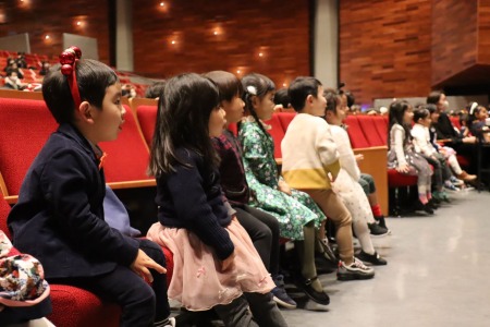 12月21日(月)、幼稚園のクリスマス会を記念講堂で行いました。年少さんは記念講堂を使うのが今回初めてです。