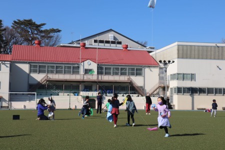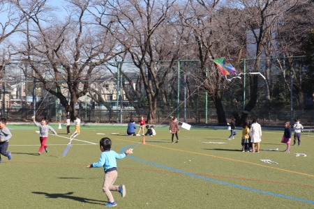 広いグラウンドをのびのび使って凧揚げを楽しむ子どもたち