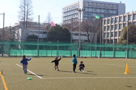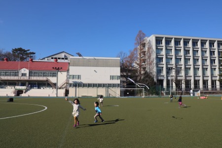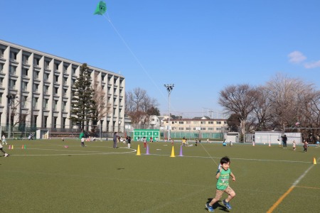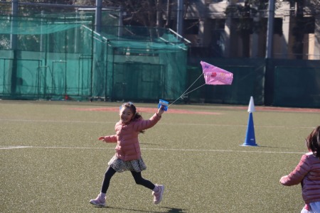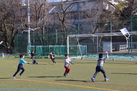 1月21(木)、22日(金)に大グラウンドで凧揚げをしました。子どもたちは手作りの凧を手に、広々とした大グラウンドで凧揚げを楽しみました。寒い時期にもかかわらずこの日は暖かく穏やかな天気。風もほとんどない日でしたが、勢いよく走って風を受けた凧はふわっと地面から浮き上がって高くあがりました。「うわーあがった!」と子どもたちは凧を手に猛ダッシュしながら大喜び。できるだけ凧が高くそして長い時間あがるように、思い切り走って凧揚げを楽しんでいました。